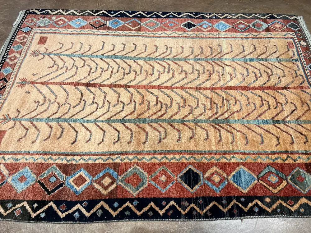 Gabbeh are tribal rugs crafted by the nomadic Kurdish, Luri and Qashqai people of the Zagros Mountains in Iran. The word Gabbeh translates from Farsi meaning raw, uncut, or natural. These rugs are a byproduct of a pastoral lifestyle, produced using wool from their sheep herd and dyes from native plants. Gabbeh rug concepts are now being copied and reimagined at many notable modern centers of weaving across the world.