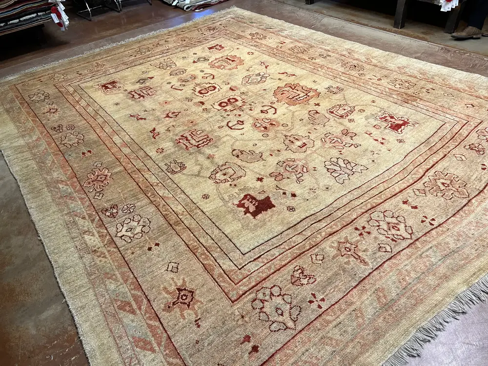 Oushak rugs originated in the small town of Oushak in west-central Anatolia, just south of Istanbul, Turkey. The designs are highly influenced by Persian designs and were highly favored in the Ottoman Empire. They are typically based on large scale geometric or floral motifs. The dyes tend toward muted earth tones, gold, blue, green, ivory or grey. Today, modern interpretations of the Oushak are being created in various rug weaving centers of the world.