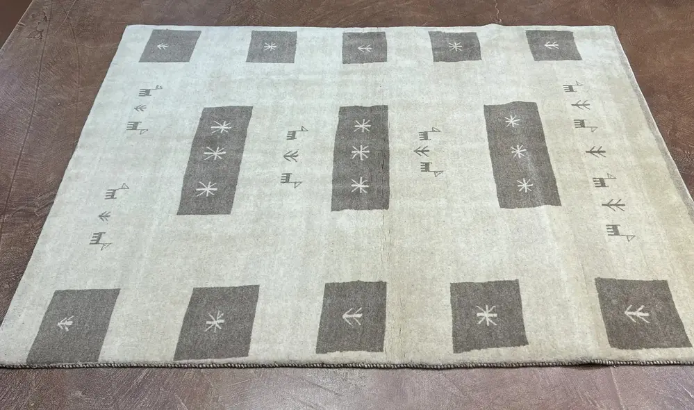 Suggested Retail Price: $1,600.00 Online Sale Price: $1,500.00 (Learn more about our shipping and returns policy) Please note, if you are buying multiple rugs or you are designer please contact us for custom pricing. This Gabbeh rug showcases the rich heritage of Persian craftsmanship with its simple yet striking geometric patterns, reflecting a timeless tradition. Made from high-quality wool, the soft, textured surface offers both comfort and durability, making it an ideal choice for contemporary interiors. The subtle palette enhances its versatility, seamlessly integrating into various decor styles while adding a touch of cultural elegance. With dimensions of 4'8" x 6'4", this piece is perfect for creating a warm and inviting atmosphere in any room. $1,600.00 Original price was: $1,600.00.$1,500.00Current price is: $1,500.00.Add to cart