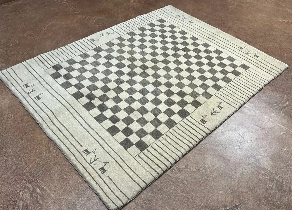 Suggested Retail Price: $1,400.00 Online Sale Price: $1,300.00 (Learn more about our shipping and returns policy) Please note, if you are buying multiple rugs or you are designer please contact us for custom pricing. Experience the artistry of this Persian Gabbeh rug, where traditional craftsmanship meets modern aesthetics. Its unique checkerboard pattern, complemented by playful motifs along the border, invites both intrigue and warmth into your home. Measuring 4'8" x 6'5", this versatile piece effortlessly enhances contemporary decor, making it a perfect addition to any stylish space. A testament to skilled artisanship, this rug showcases a rich heritage while seamlessly fitting into today's design trends. $1,400.00 Original price was: $1,400.00.$1,300.00Current price is: $1,300.00.Add to cart