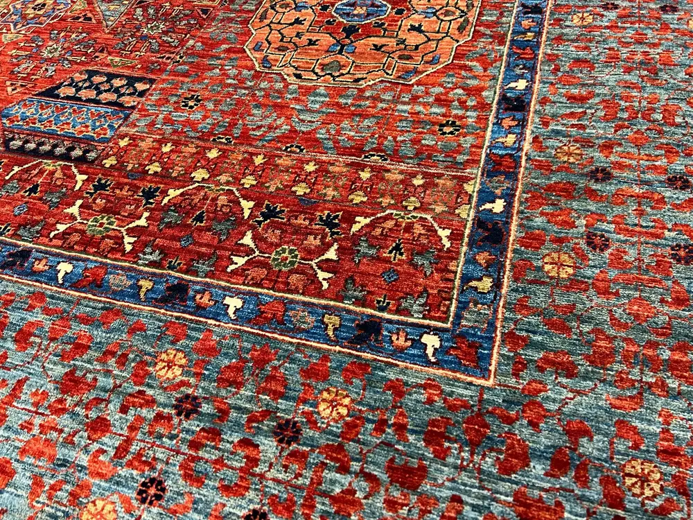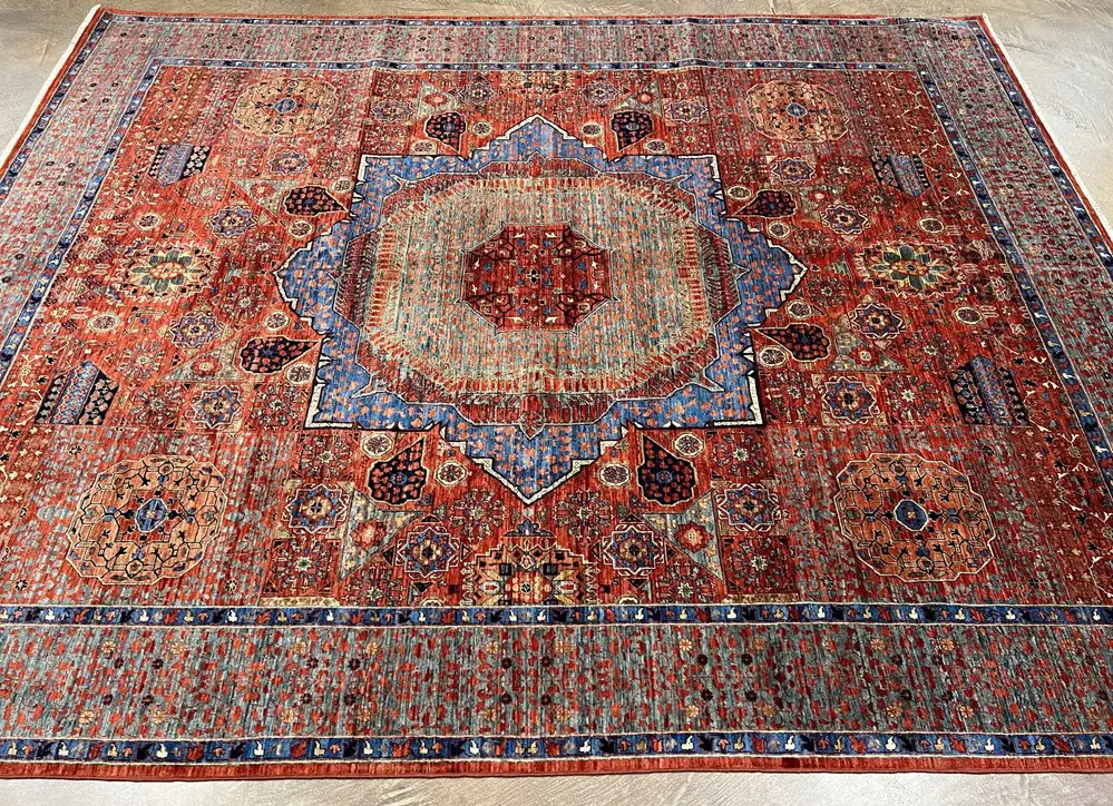 A pattern arising from Cairo, Egypt, the Mamluk design is a central medallion surrounded by a variety of smaller, symmetrical geometric motifs, forming a kaleidoscopic appearance. The rugs are mostly boldly colored in gem tones, but neutrals are also occasionally found.