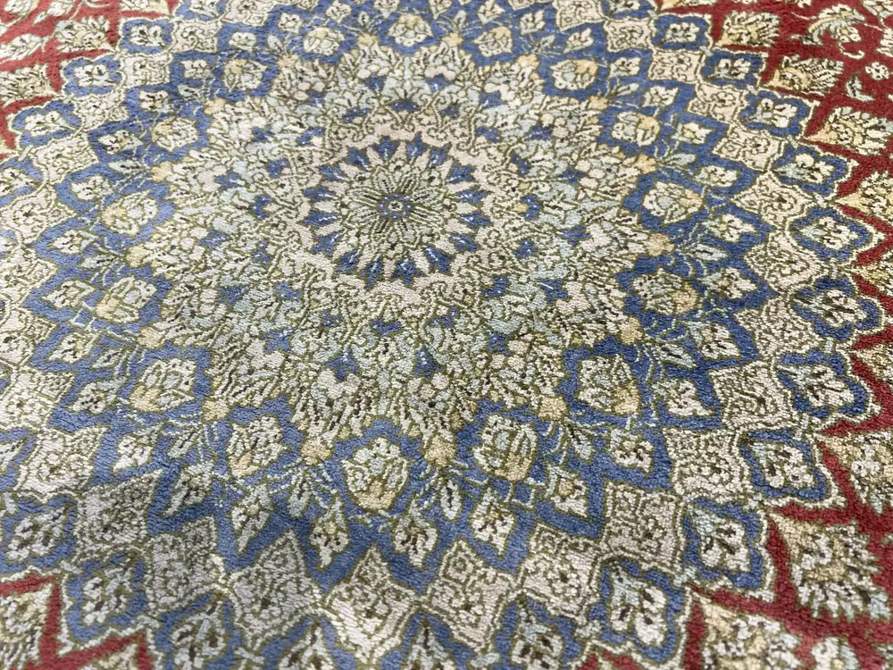 Ghom rugs are made in the Ghom Province of Iran. Although rug weaving in Ghom was not a major industry until the past 100 years, the luxurious silk and wool rugs of Ghom are known for their high quality and are regarded among the most expensive in the world. Persian Ghom rugs are often considered an investment because of their increasing value. Tree of life and medallion motifs feature heavily in rugs knotted in Ghom. The rugs are normally woven with jewel-toned colors such red, blue, and ivory, but can appear in any color.