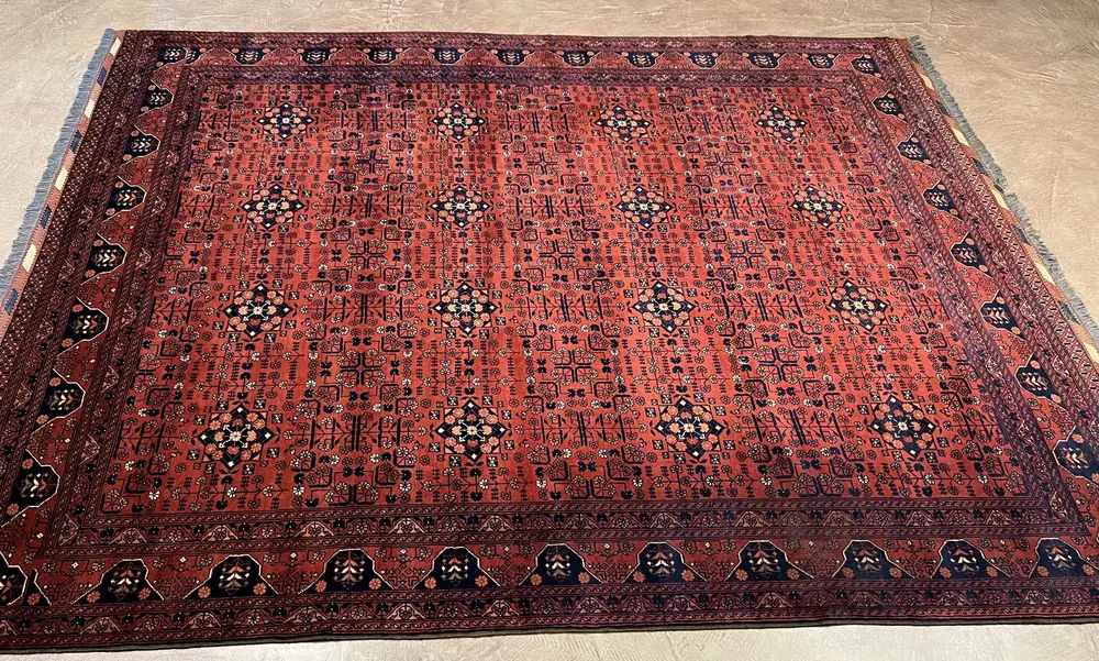 Turkoman rugs are known for their highly detailed, geometric patterns, often featuring a combination of stylized floral and tribal motifs. The most distinctive feature of these rugs is the 'gul' – a repeated medallion-like design that varies in shape and size. The wool is dyed using natural pigments extracted from plants and minerals, resulting in a rich and vibrant color palette that includes deep reds, blues, and warm earth tones.